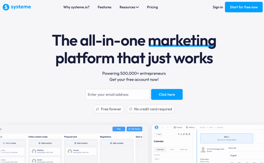 Systeme.io is a free all-in-one starter tool that covers funnels, email, and digital product delivery in one place. It’s built for new creators who want to test an offer before spending money on software, with basic marketing automation features included.