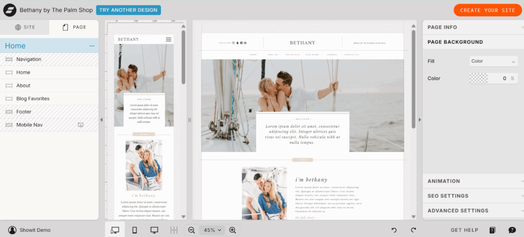 Showit offers total design freedom. You literally get a blank canvas and can place any element anywhere. It’s like working in design software; you aren’t constrained by column grids or rigid templates. This complete creative control means you can craft a unique layout for every section of your site.