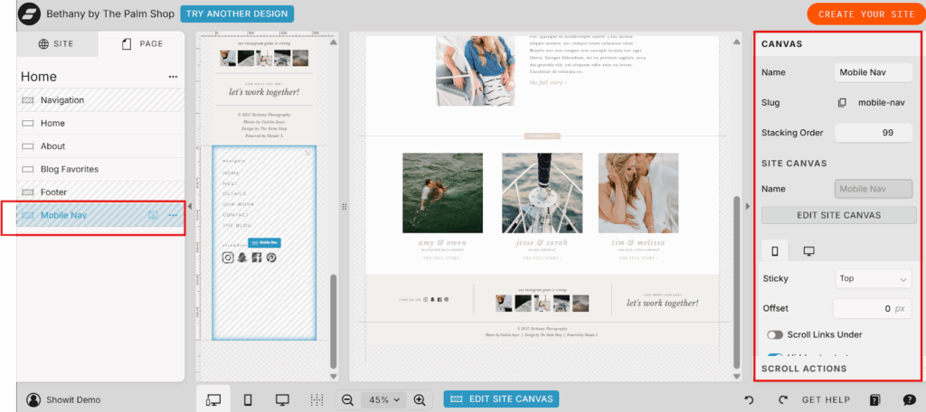 Showit also has canvas blocks or “site canvases” – reusable page sections – so you can design a section once and use it on multiple pages. For example, you can design a footer or call-to-action block and have it update everywhere it appears.