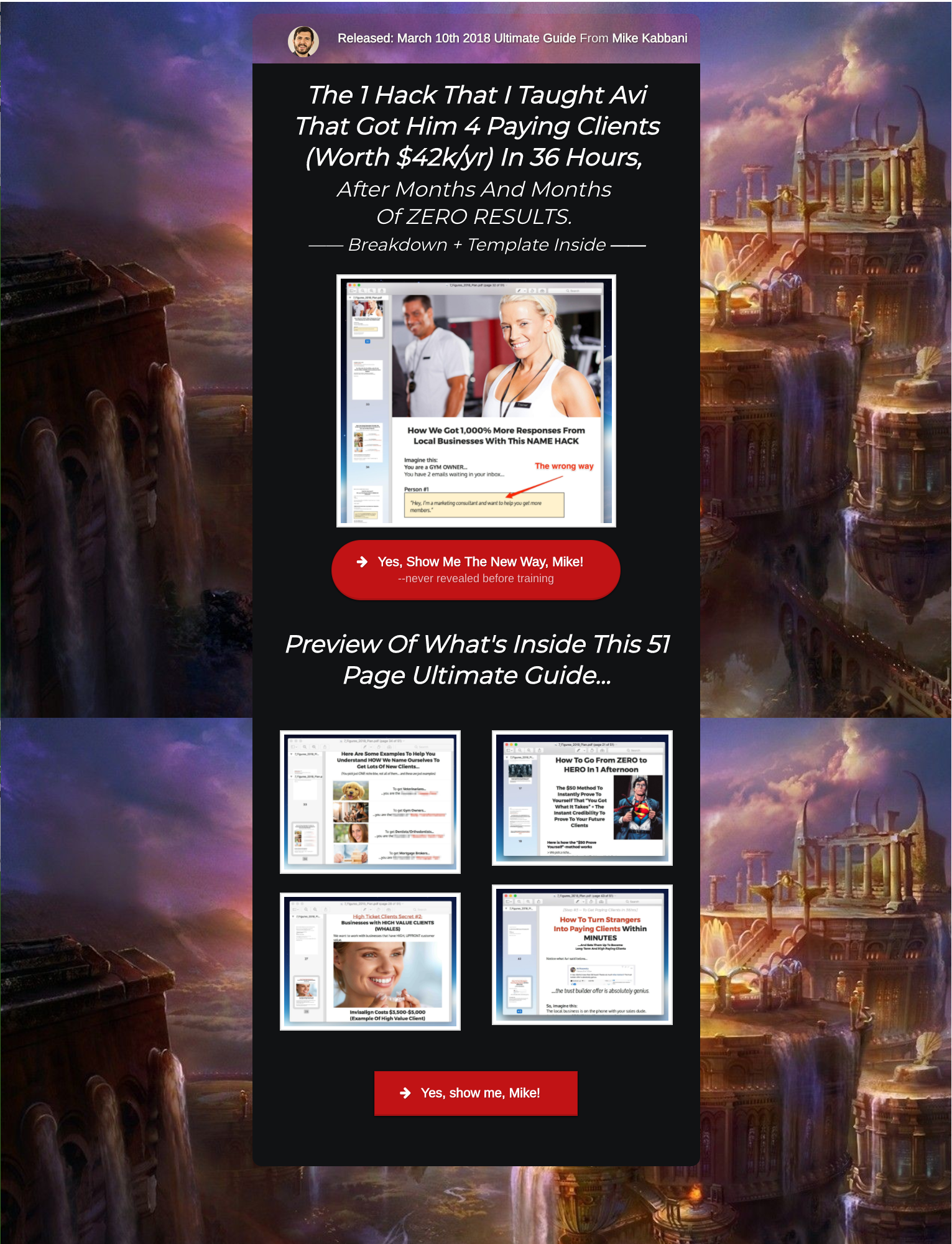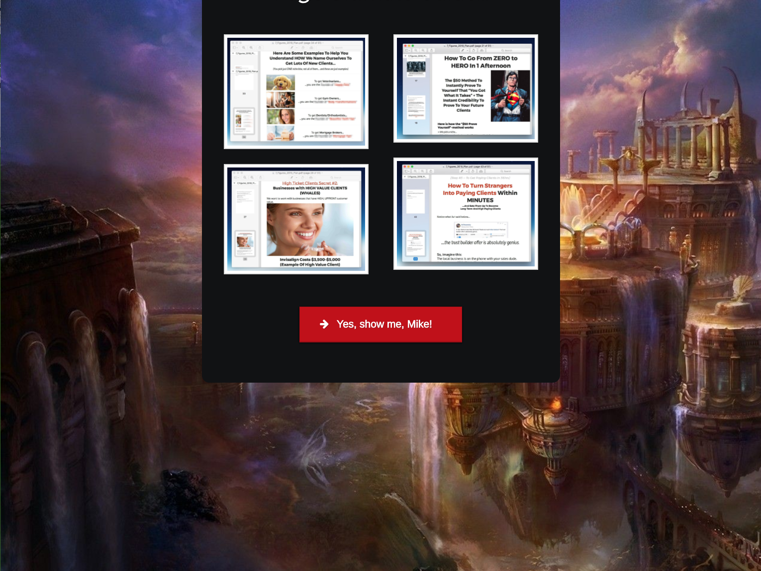 And it’s a good thing we know we landed in the right place, because if it wasn’t for this image – plus Mike’s headshot at the top of the page – we’d have no idea. The background is an epic fantasy landscape, which is possibly tailored for Mike’s League of Epic Consultants branding. He revisits this theme later on, in the second half of the sale.
