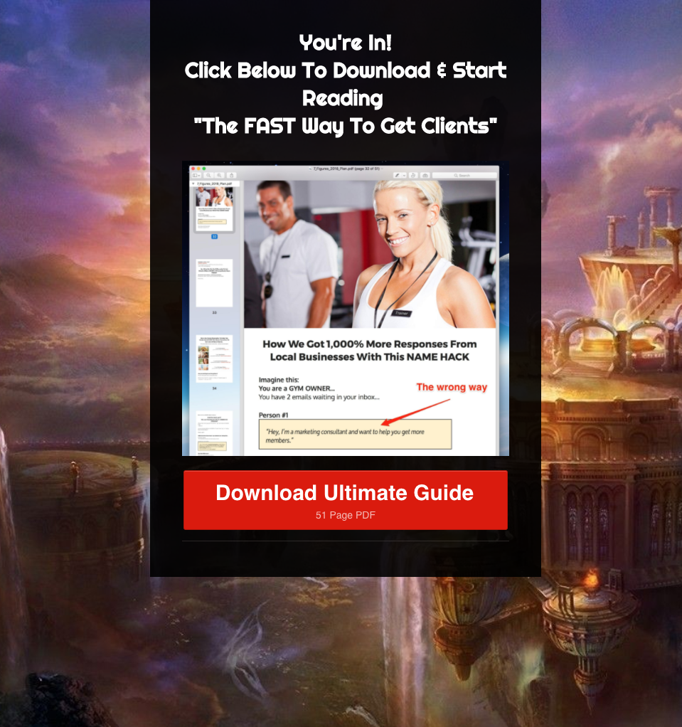The PDF itself delivers on all of Mike’s promises, but it also primes them for the follow-up sale. The headline is almost exactly the same as the ad, recalling it to our minds – we remember that giant list of bulletpoints, and know we’re about to get some relevant and high-quality information.