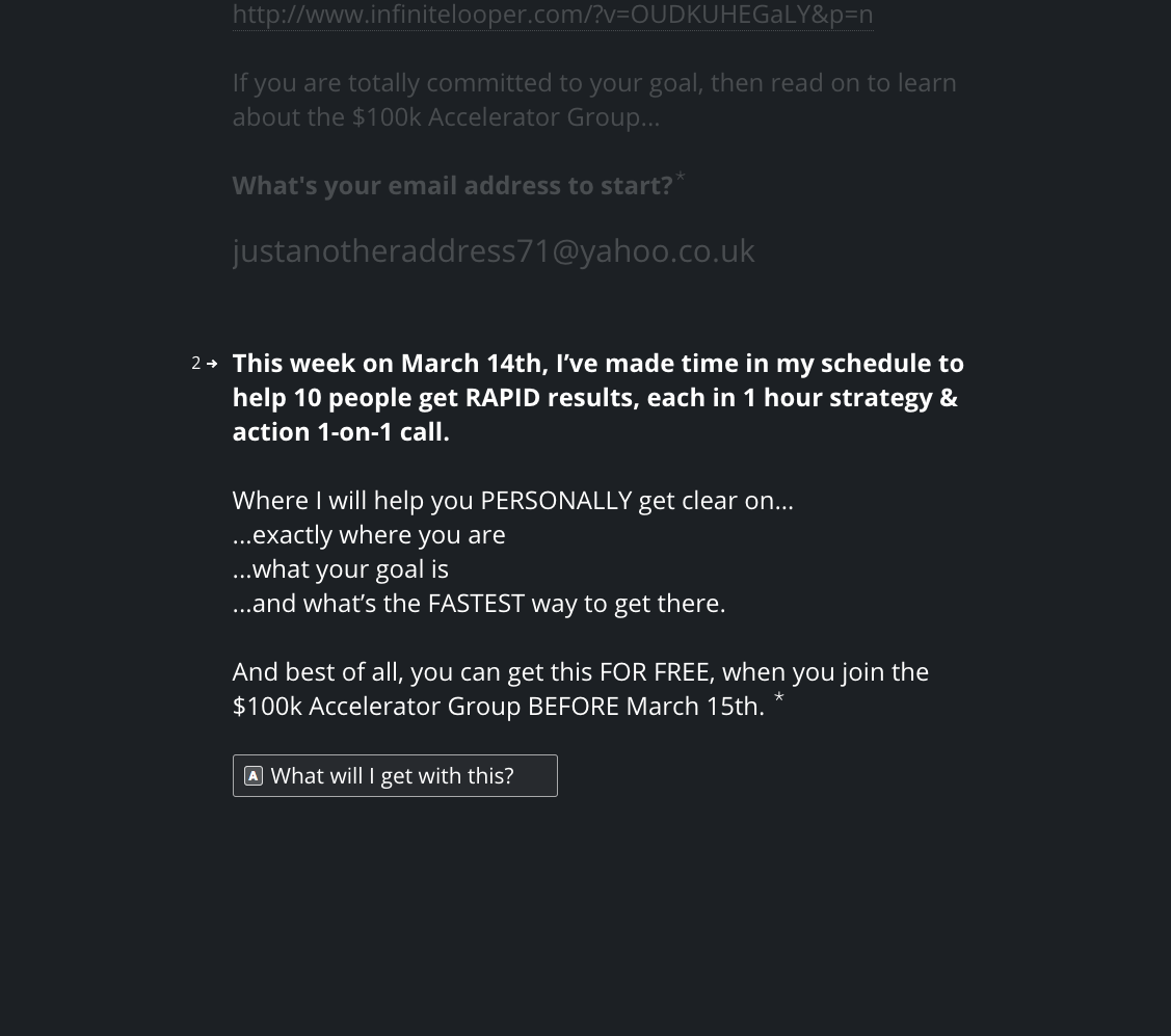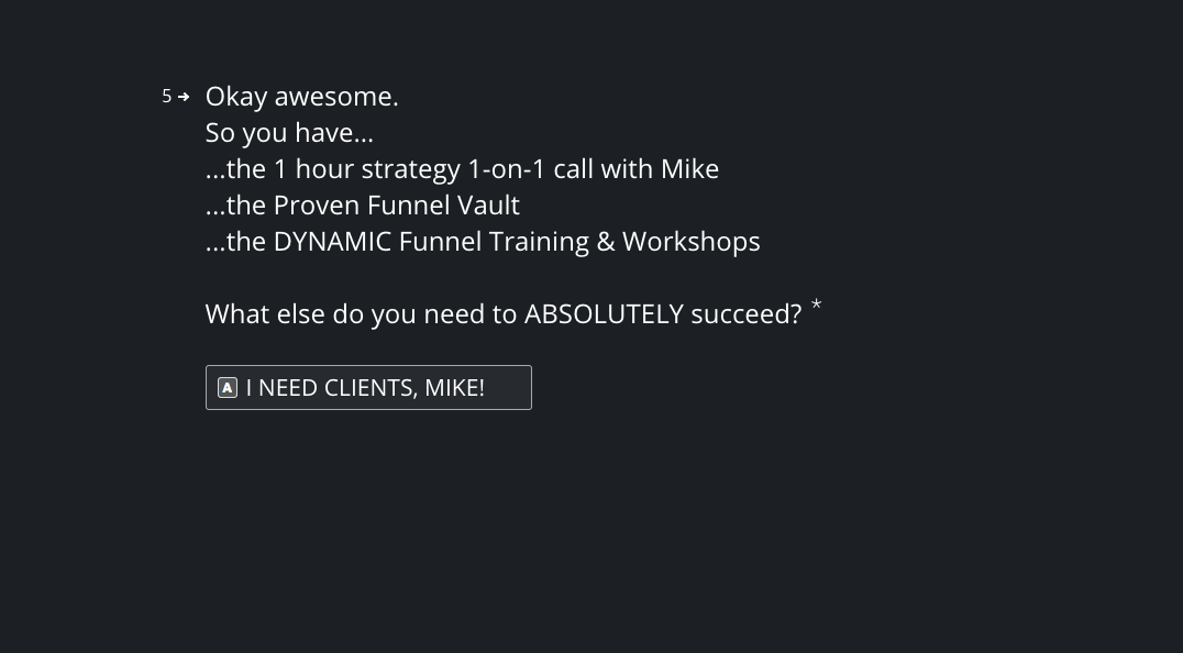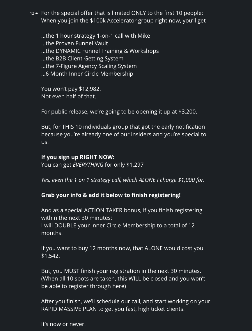 Mike begins to stack the value, adding more and more to the offer. It’s a lot. And each CTA is unique: sometimes questions to prompt us to find out more, peppered with enthusiastic confirmations. This makes us think that while Mike is talking, we’re giving him actual responses which gives the illusion of control and that we’re guiding the conversation. We aren’t being sold to – we want this.
