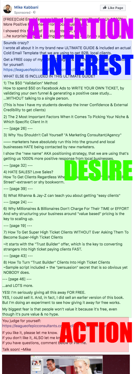 The first thing you notice is the same picture used in the Facebook ad, so you know you landed where you expected to be. This image uses a red arrow to draw attention to a problem or ‘wrong way’: in this case, it’s the line “hey, I’m a marketing consultant”, which is how most crappy marketing consultants start their spiel. It’s a classic clickbait technique, but here it works.