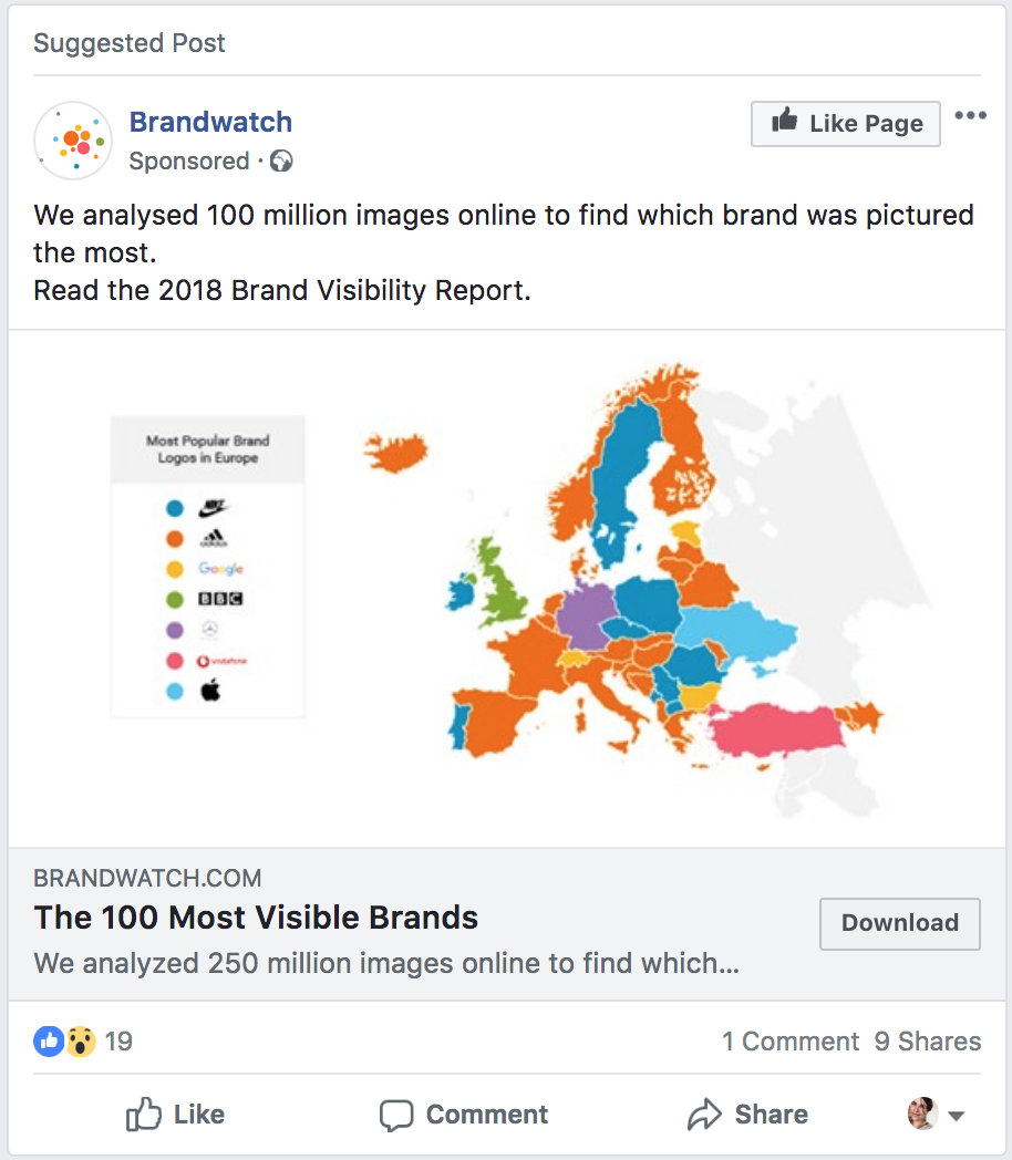 The condensed image may serve another purpose, as we realise the map key contains familiar shapes. Those are the logos of huge corporations such as the BBC, Vodafone and Apple. Going by the title, “Most Popular Brand Logos in Europe”, Brandwatch may not have actually worked for these companies – we don’t know – but these logos add subtle social proof.