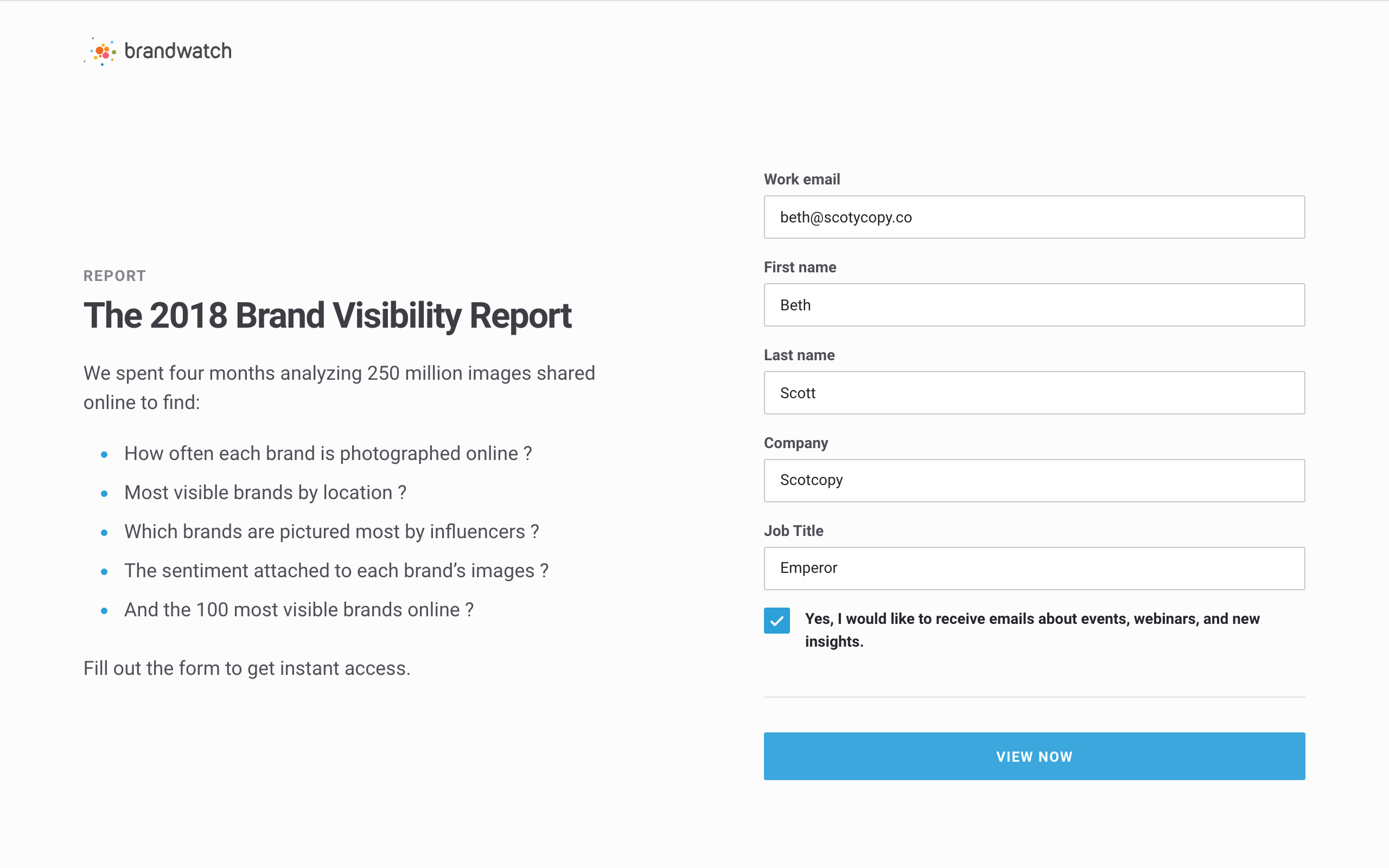 Clicking the CTA takes you to (counts on fingers), yes, Opt-in 4. Or, rather, opt-in 1 – it’s exactly the same page. Identical URL, same content, no customisation, no tracking – we’re literally signing up for the report, again, and when we do, we’re taken to the entire 2018 Brand Visibility Report page.