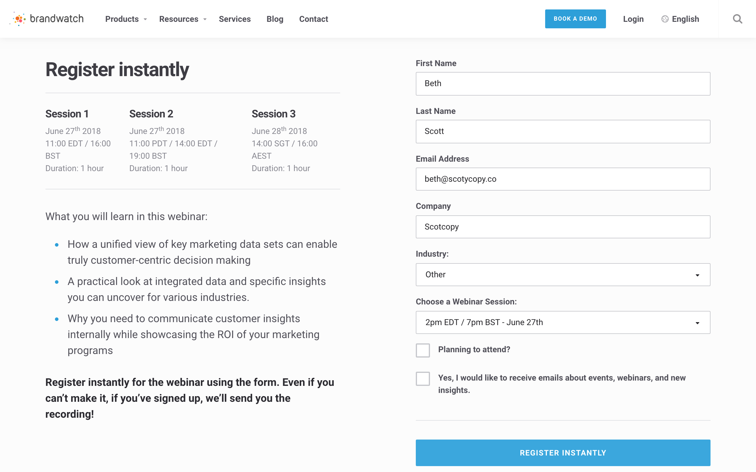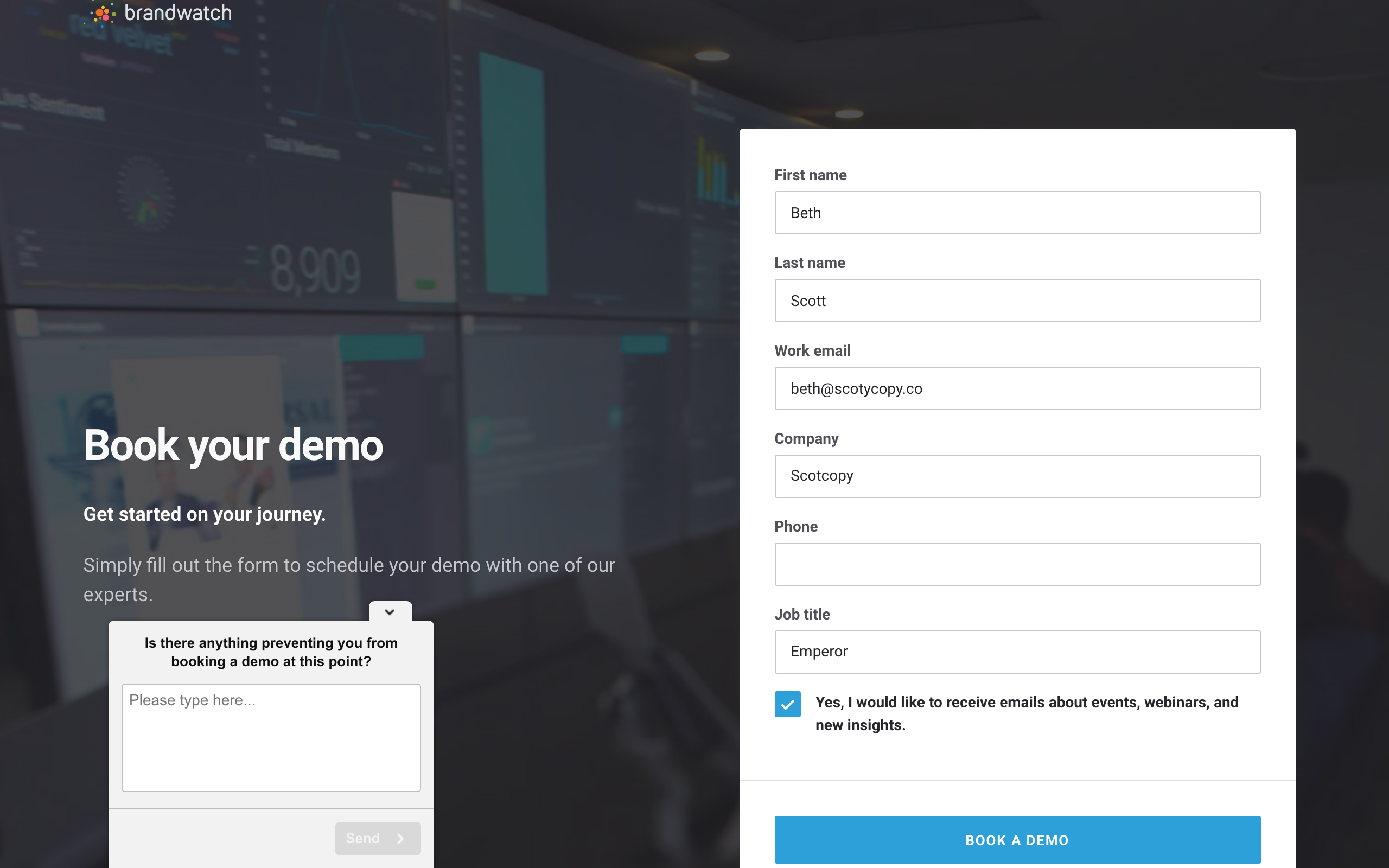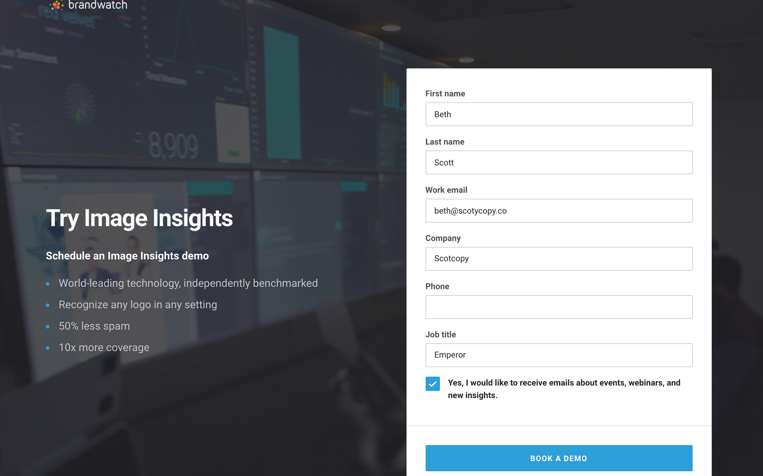We’ve submitted our details, we’re off to the webinar, we’ve booked a demo and now Brandwatch has our phone, company, industry, email and beverage preference.