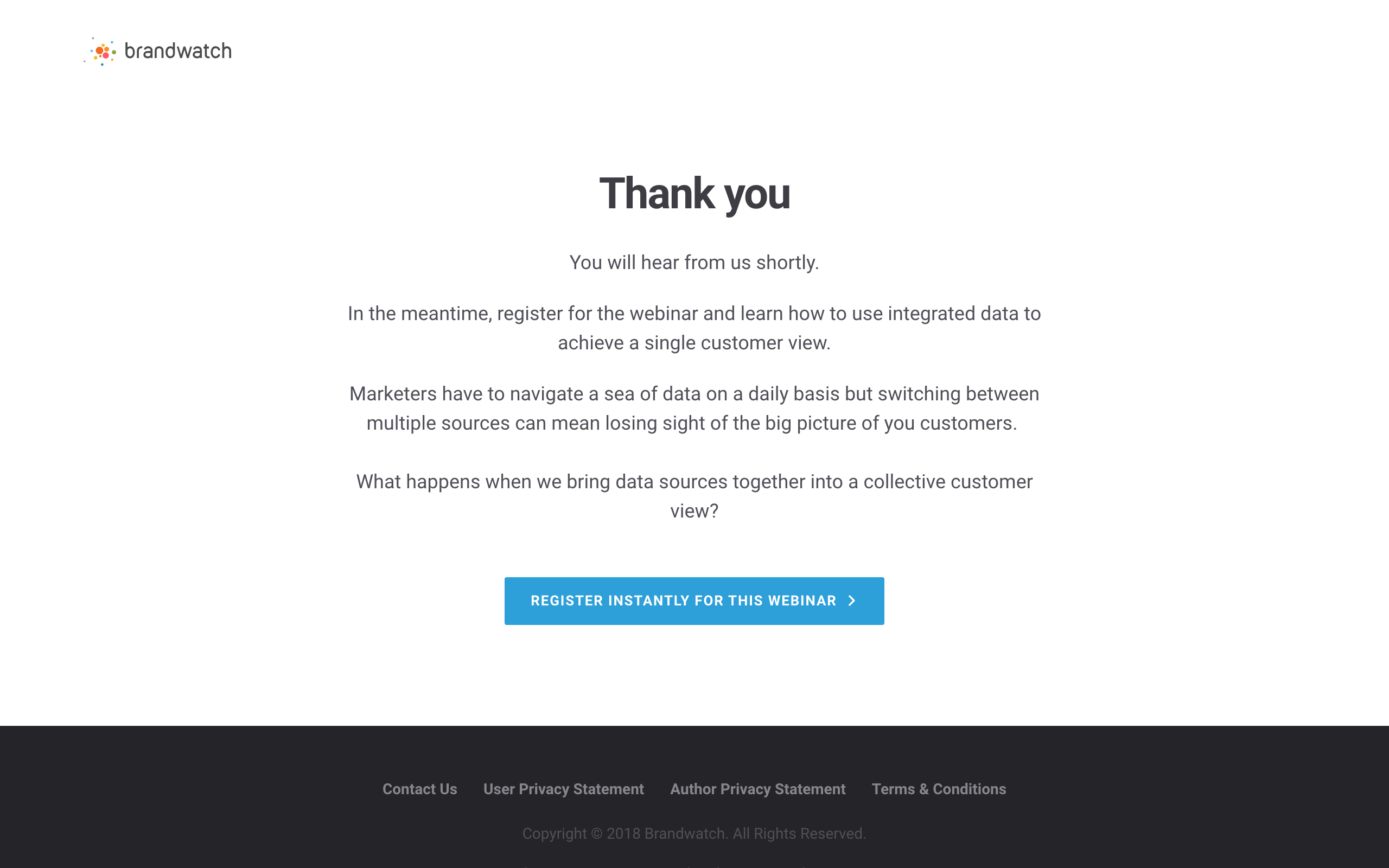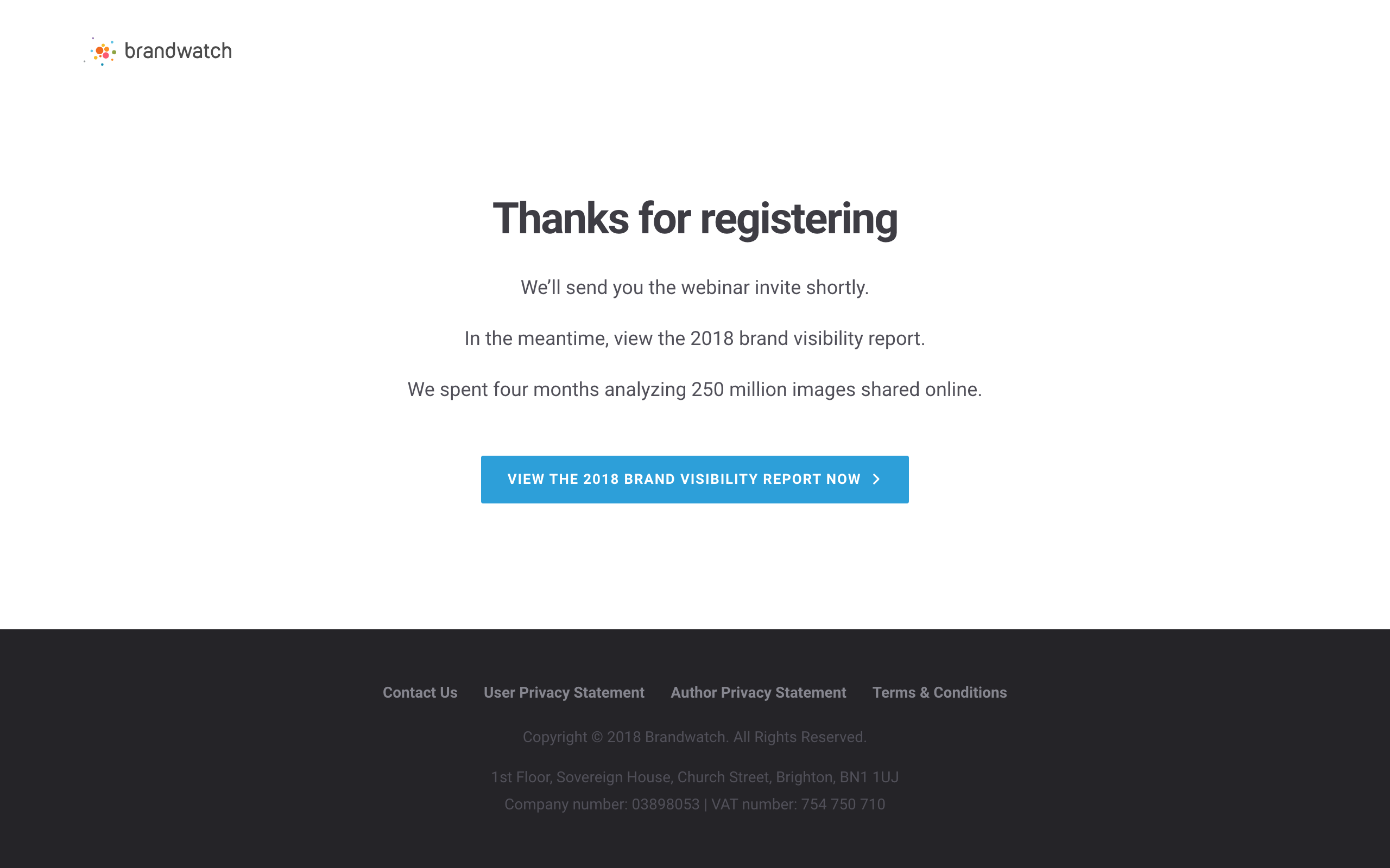 After submitting the information, we’re taken to the thank you page: a few simple, centre-aligned paragraphs under a bold header. Brandwatch’s brand identity is once again coming across as strong, and there’s a sense of satisfaction about knowing we’re in the right place, and have what we came for.