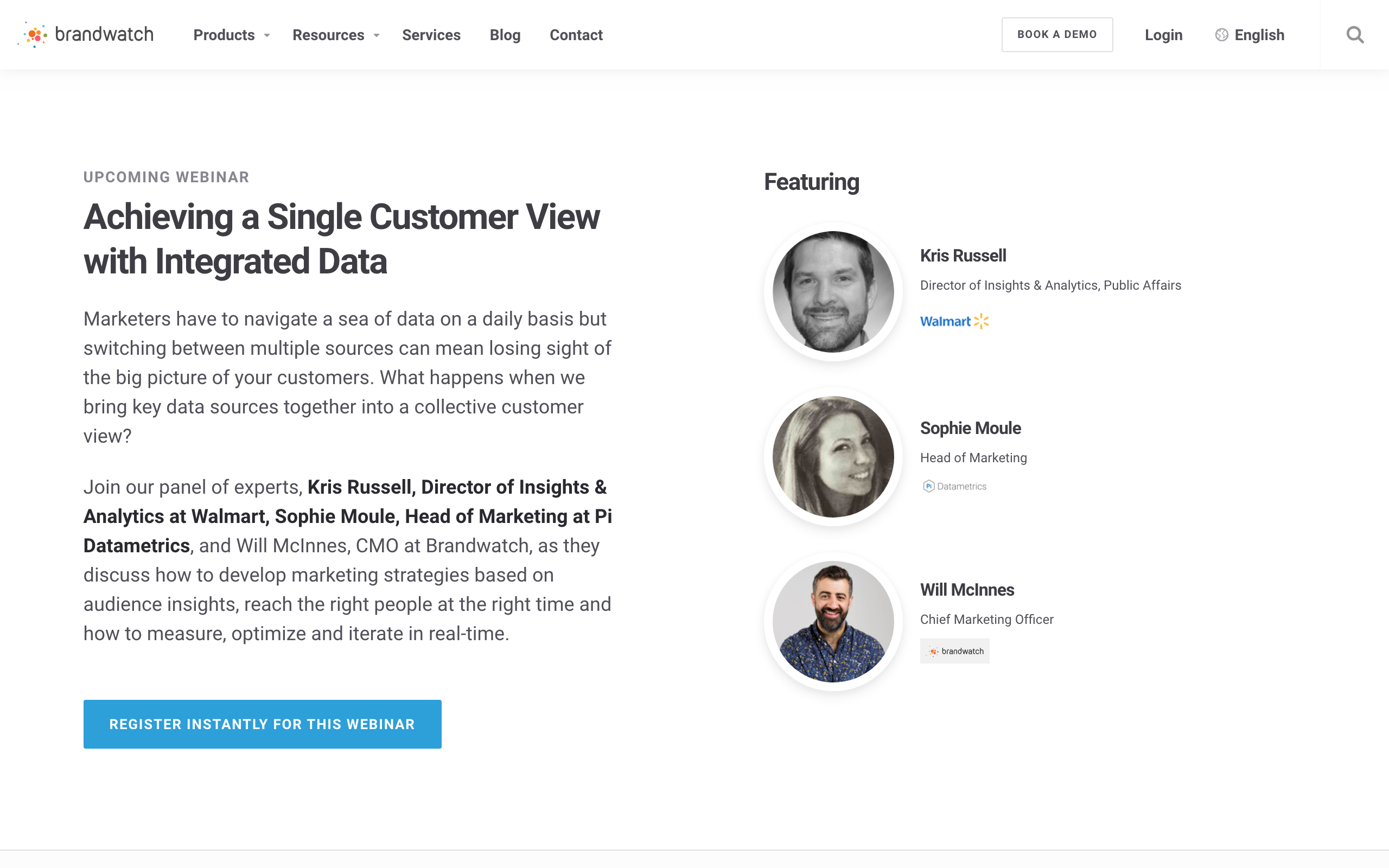 A different opt-in style here, with a type of image Brandwatch hasn’t included yet outside of its lead magnet content: human faces. We’re presented with more social proof in the form of featured presenters, complete with impressive corporate logos. This goes further to reassure us this content is trusted, comprehensive and valuable – Brandwatch isn’t the only one who believes in this webinar, it’s Walmart and Datametrics, too.