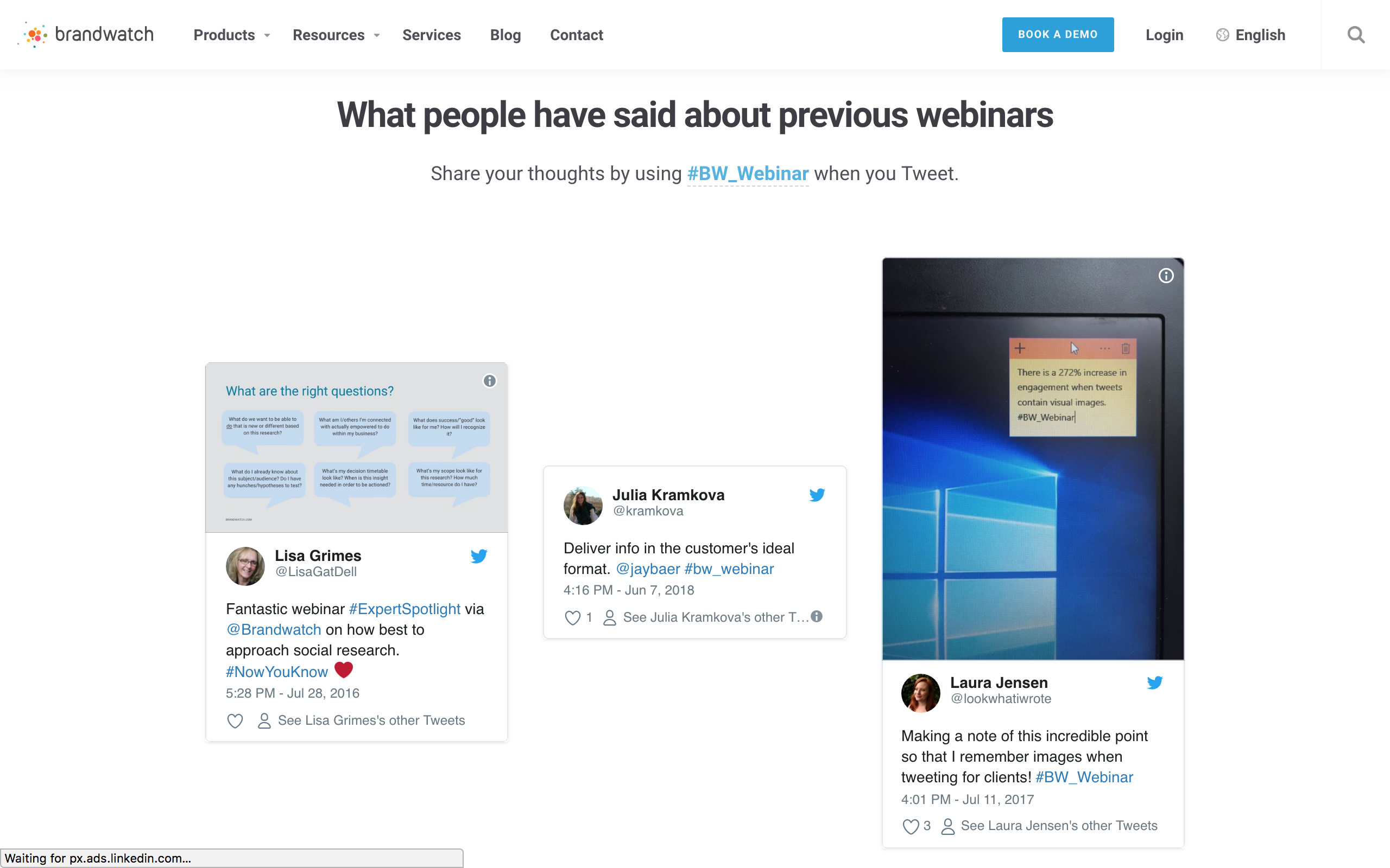 But, in case doubt lingers, scrolling down reveals some testimonials, not for Brandwatch’s services, but rather the webinars themselves. These are gleaned from Brandwatch’s Twitter account, likely saving them time tracking down and asking for “proper” testimonials from previous attendees – it looks viral, it’s hyper-focused, and it really works.