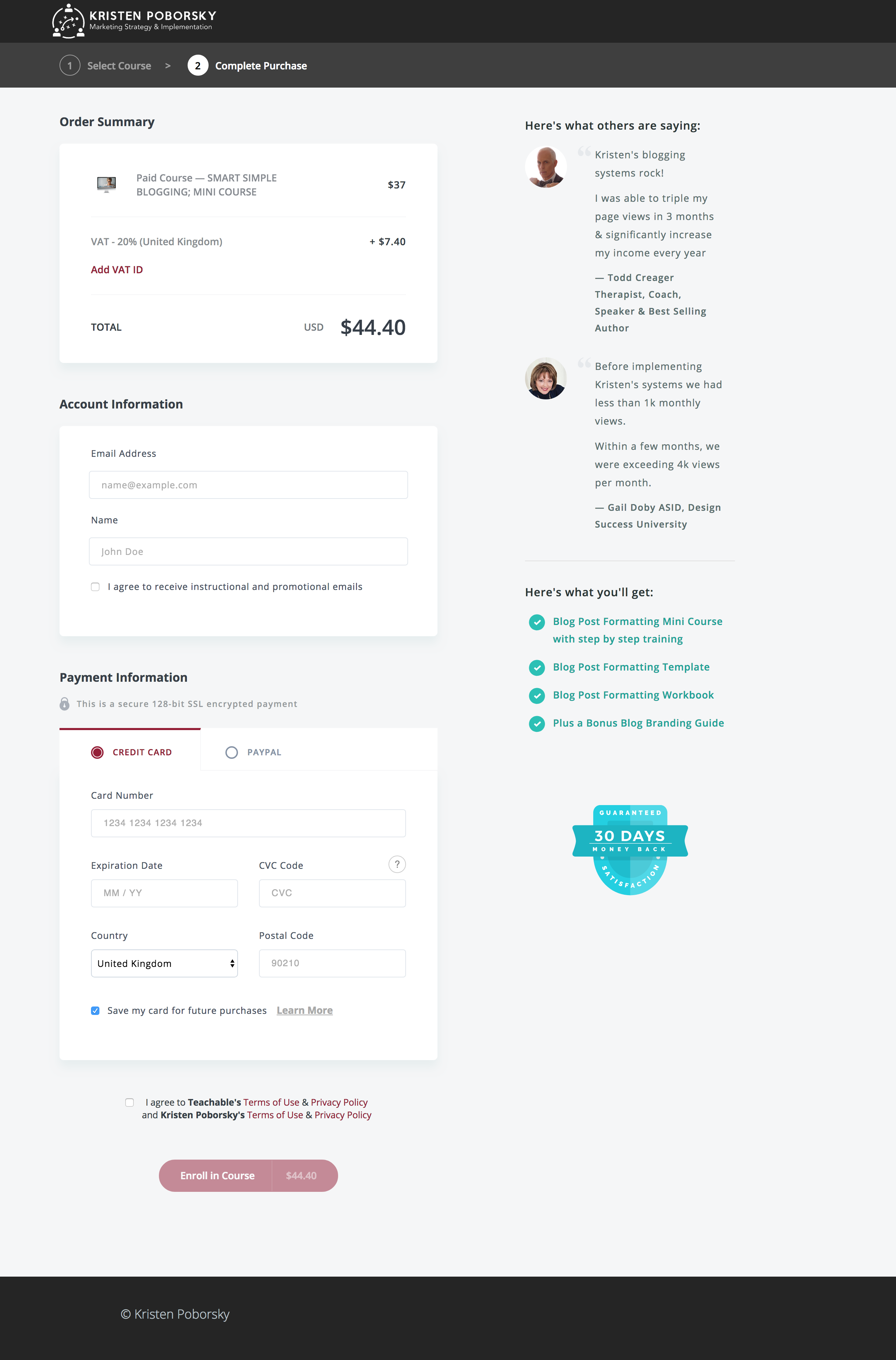 If we had any doubts here, they’re allayed by the professional layout of this checkout as well as a large guarantee shield logo, bullets of exactly what’s included in the course and some impressive testimonials – which, ironically, would have sold me more effectively on the upsell page. Why wait until now to use social proof? It makes no sense – the layout is nice, but there’s been no thought beyond it.