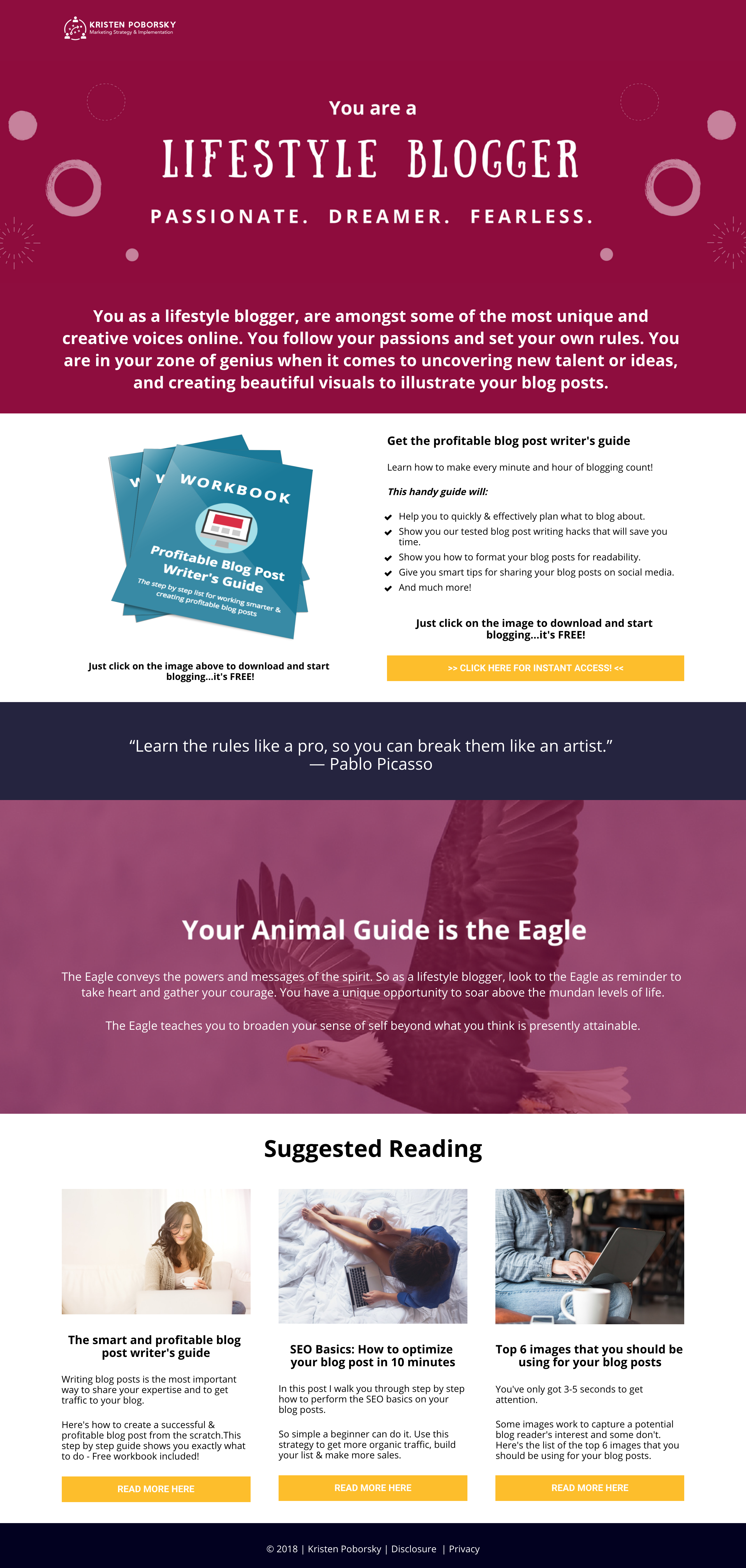 And what – oh, what – is with those animal guides, Kristen?! Nowhere else in this funnel – or her entire site – alludes to spirituality or creativity with this kind of imagery in any way, shape or form. It’s totally out of place.