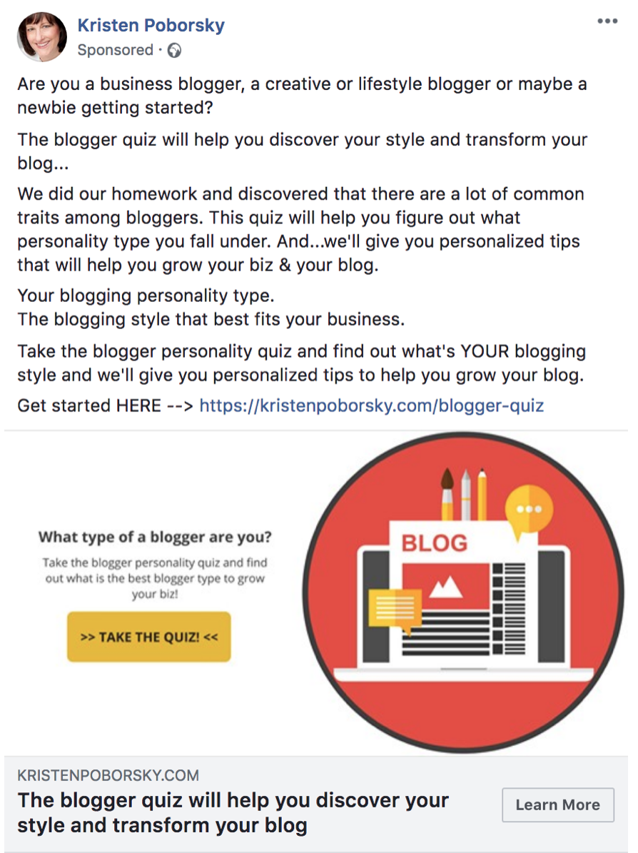 The text of the ad is structured as a simple sales message rather than a personal post, using a question to qualify the audience: “are you a blogger?” Anyone who is or wants to be, hopefully reads further. Anyone who isn’t, scrolls on by. This ad has a few small mistakes and the copy needs reviewing. For example, “find out what’s YOUR blogging style” is grammatically incorrect, as is the use of ampersands and ellipses.