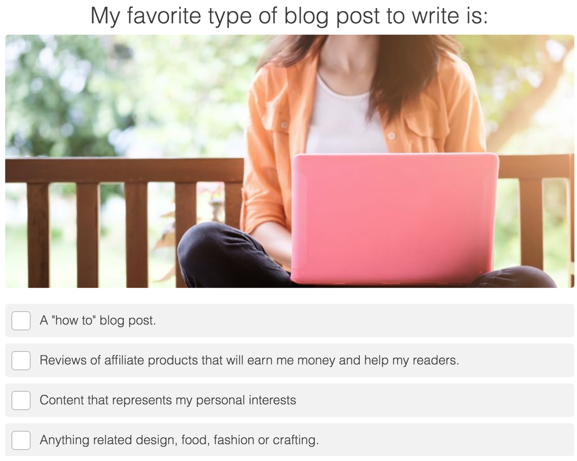 Each header image has two things in common: women, and laptops. Not much else. Nothing really relating to each question, or even the subject of blogging in general. The questions are fairly well thought out, and attempt to dive beneath the surface with asking how the taker feels about writing a blog as well as their specific goals.