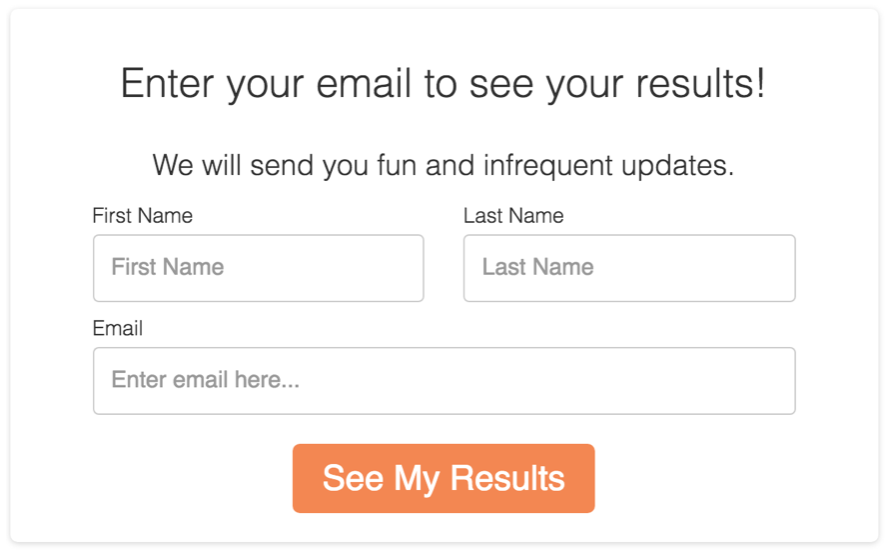 Despite this, the CTA is “See My Results”, which leads us to believe they are viewable on the next page. However, it’s impossible to view results without entering your email. This is a common technique because focusing the CTA on what the prospect will get in return (i.e. a benefits-driven CTA) is more effective for conversions than one that reminds them they’re handing over their email to yet another newsletter.