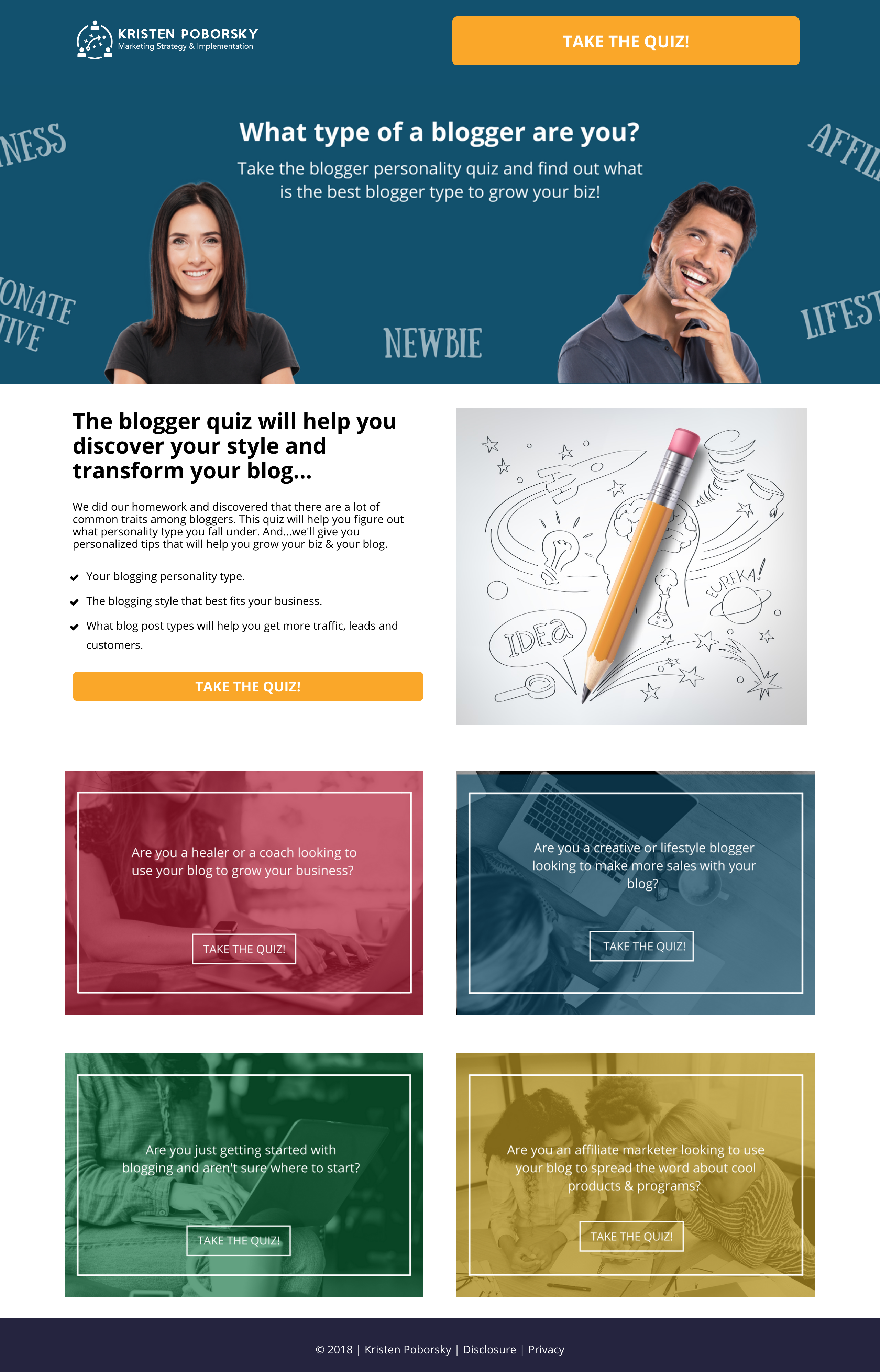 We’re taken to a squeeze page, which looks fairly polished. No brand identity that ties it in to the ad save the Kristen Porborsky logo, and only the big yellow Take the Quiz button is the same as the version we saw in the ad image.