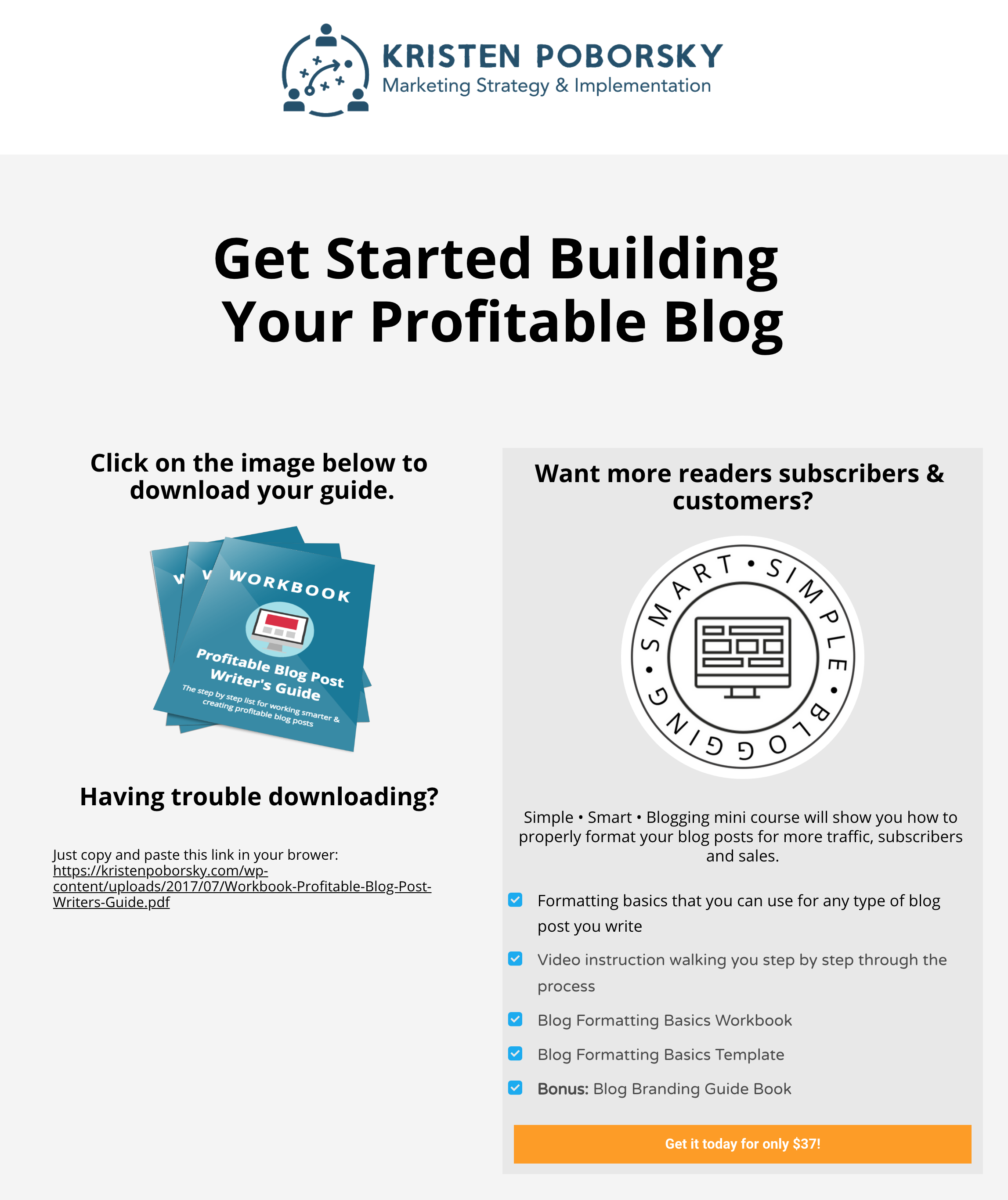 This is a funnel from Kristen Poborsky, a marketing strategist and business expert who’s been helping entrepreneurs and small business owners to get more traffic, build lists, and sell more products and services since 2009.