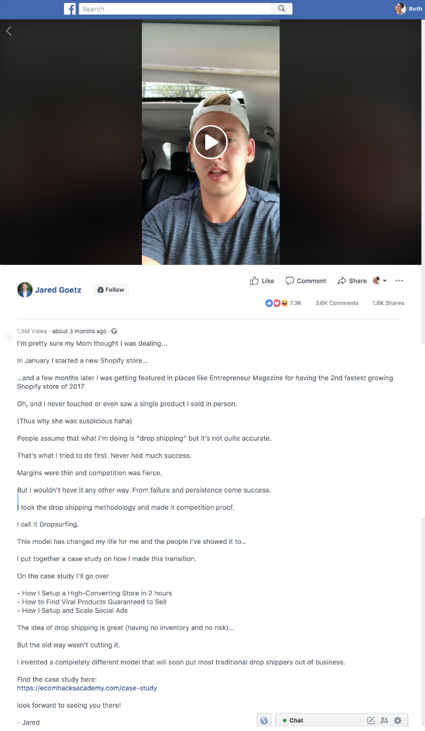 The video is a quick 2 minute handheld shot featuring Jared and his mom in a car. He paraphrases what he says in the text description, that his mom thought he was dealing, that he set up a Shopify store and can show you how to use his method. The ad is designed to grab the attention of readers and viewers alike, as the message is exactly the same, to maximise the potential reach.