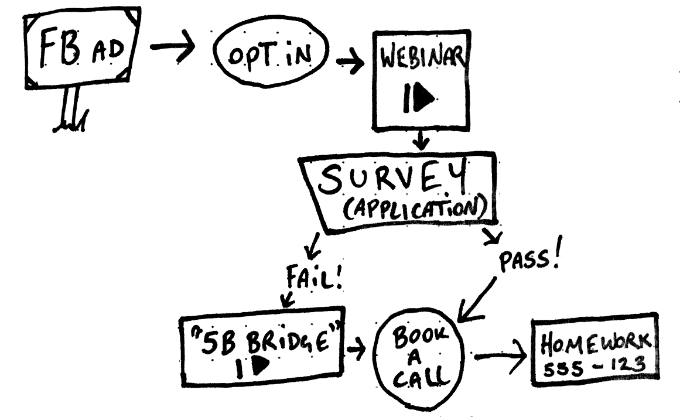 His goal with this funnel is to get you to book a call with him, with a view to enrolling into the eCom Hacks Academy. Here is our in-house Picasso’s interpretation of his funnel: