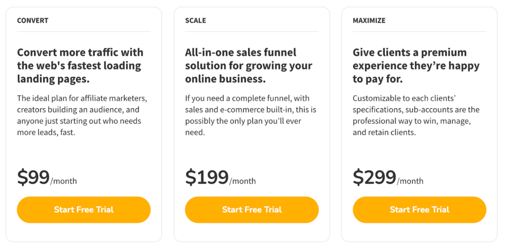 Convertri offers a pricing structure that’s transparent, flexible, and tailored to businesses at different growth stages. Whether you’re just starting with the Convert plan, scaling your funnels with Scale, or managing multiple clients on Maximize, Convertri gives you fast-loading pages, drag-and-drop freedom, and built-in tools that streamline your marketing. Annual billing can save you significantly, and the 14-day free trial lets you test everything risk-free.