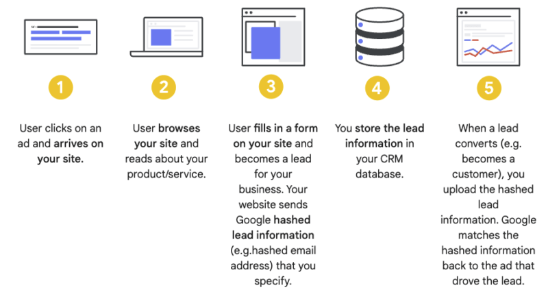 When a lead converts, you upload that lead’s hashed information, and Google matches that information to the ad that drove the lead. This gives the platform – and you – a more complete picture of the customer’s full journey.