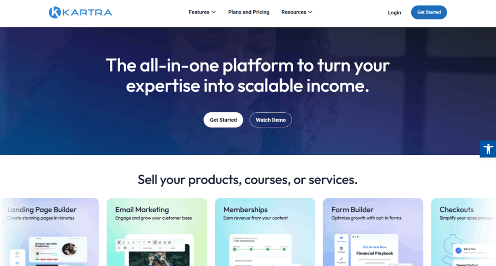Kajabi is an all-in-one platform for coaches, experts, and course creators, combining website building, sales funnels, marketing automation, and content tools in one dashboard.